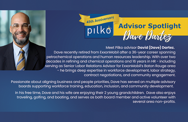 Meet Pilko’s David Dartez – a retired ExxonMobil leader with 36+ years of experience in refining, chemicals, and HR strategy- bringing deep expertise in workforce development, labor relations, and people-focused leadership.
